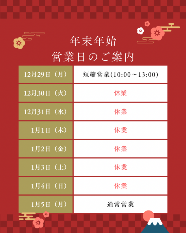 2025.12.29お知らせ年末年始 営業日のお知らせ